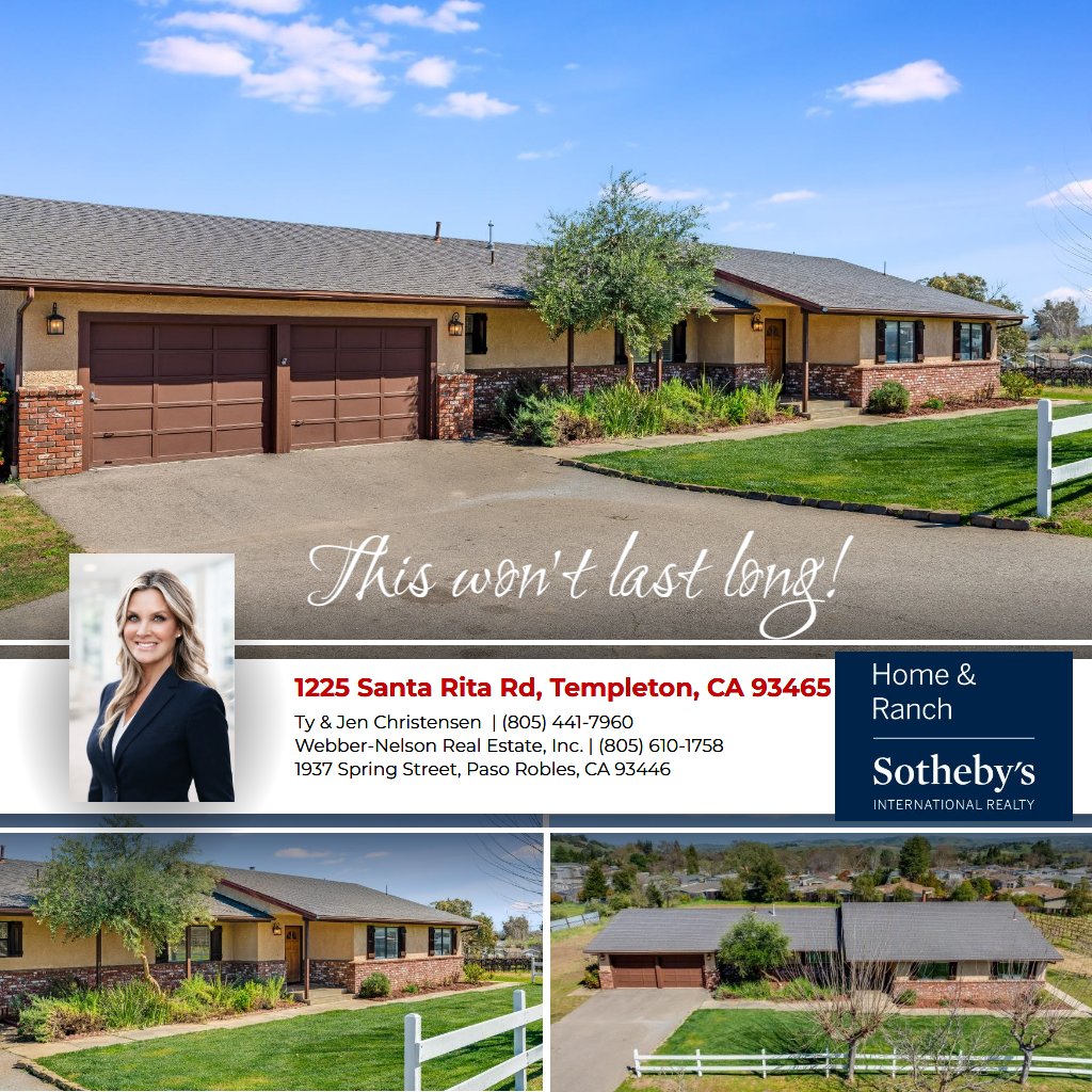 Experience the charm of West Templeton wine country at 1225 Santa Rita Road. Set on approximately 3.5 usable acres, this inviting 3BD/2.5BA home offers 1,718± sq. ft. of comfortable living space surrounded by a scenic vineyard setting. Approximately 1.7 acres are planted to Malbec grapes, creating an authentic wine country feel, with wine from the vineyard earning 93 points from Wine Enthusiast. Inside, the home features an open kitchen concept with a center island, a welcoming living room with a freestanding wood-burning stove, and a covered back porch ideal for relaxing and taking in the peaceful surroundings. The property also offers room for horses, gardens, or 4-H/FFA projects, along with several producing walnut trees, a long private driveway, and a large 2-car garage with workshop area. Located within the highly regarded Templeton School District and offering both private irrigation well and Templeton CSD water service, this appealing property combines the comforts of country living with everyday convenience, just minutes from Templeton, Paso Robles, Trader Joe’s, and other nearby amenities.